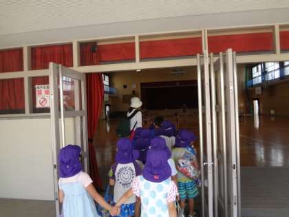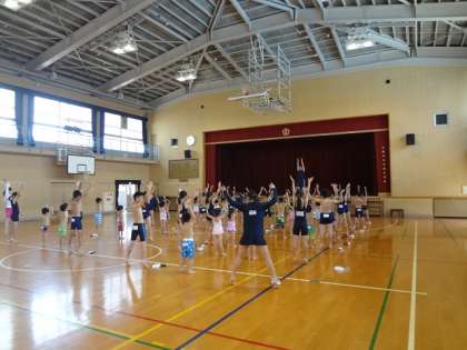 5年生が待っている体育館に園児が到着。自己紹介の後、みんなでラジオ体操をしてから、プールに移動しました。