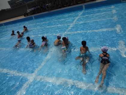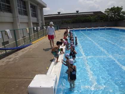 小学校のプールにも徐々に慣れ、ジャンケン列車・宝さがしなどをして楽しみました。