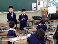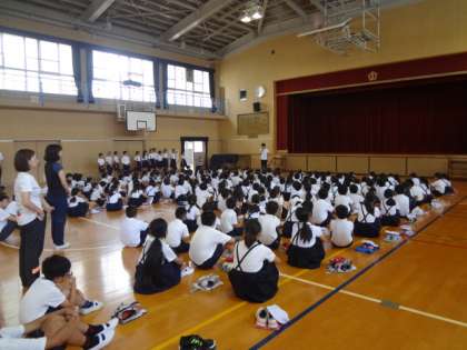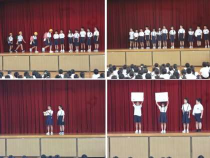 計画委員の児童が、今学期に行った“記名の日”“右側歩行週間”や、来週に行う“あいさつ週間”について劇を交えながら全校児童にアピールしました。