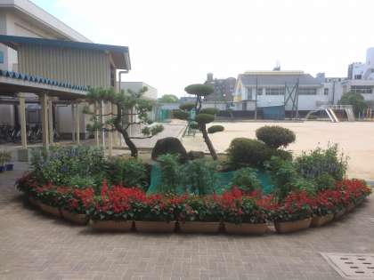 玄関近くの池の周りには花がきれいに咲き、長原小学校に来られた方々をお迎えしています。