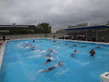 服を着て泳いだ時と、服を脱いで泳いだ時とでは、どれほど泳ぎやすさの違いがあるかを体験しました。