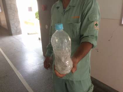 ペットボトルに入れた肥料を、ふたにあけた穴から吹きつけてまいています。