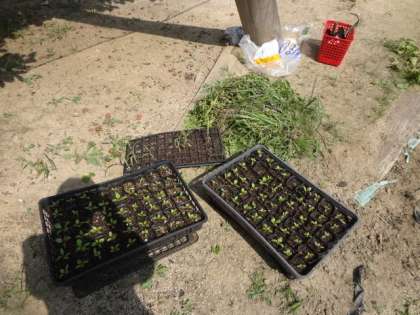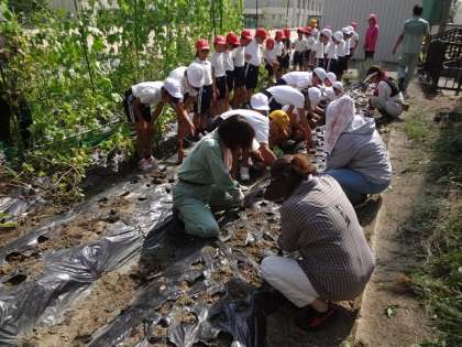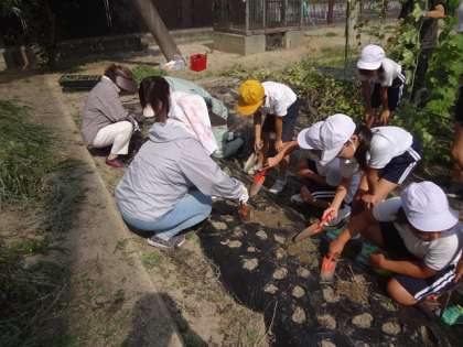 4年生が長原ガーデンのふれあい活動で、地域の方々とともに“虹色菜”と“トウモロコシ”の苗を植え替えました。