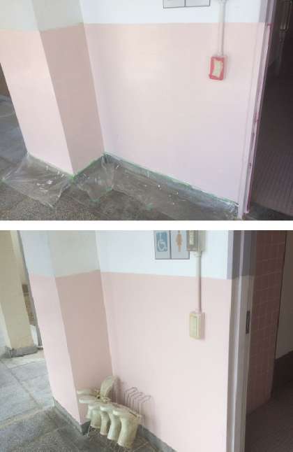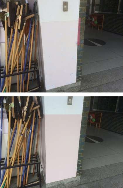 廊下の壁のペンキが何箇所かはがれていましたが、管理作業員さんが子どもたちの休みの間に少しずつきれいにしています。ビフォー・アフターをご覧ください。