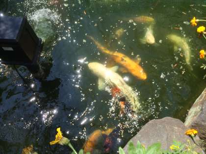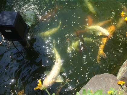 管理作業員さんが池にエサを入れた瞬間に、コイたちが争うようにして食べ尽くました。