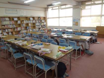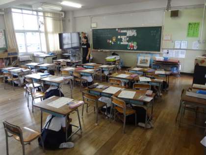 先生の指示に従い、子どもたちは机の下に身を隠しました。