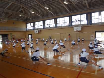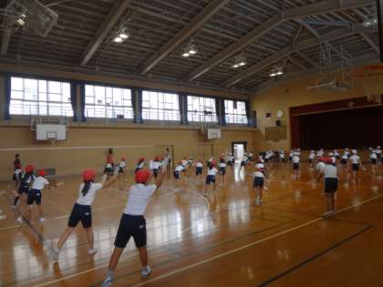 場所の感覚が少しでも本番(運動場)に近づくように、講堂で練習する位置も前の週から少し変わっています。