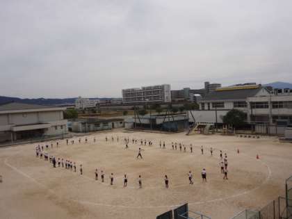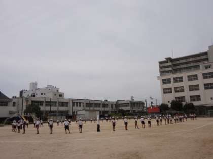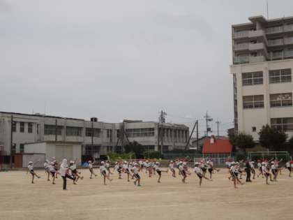 運動場での立ち位置を確認しながら、演技の練習を進めています。