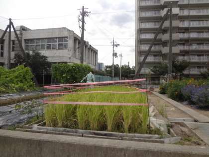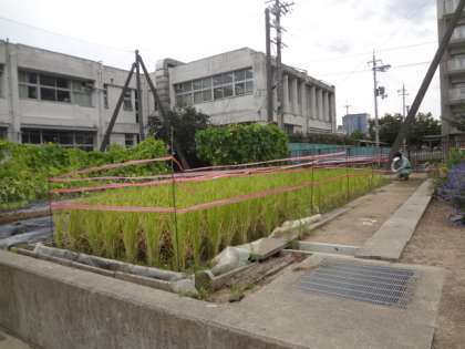 水田の稲がさらに実ってきましたが、管理作業員さんが鳥よけのテープを張りめぐらしてくれました。周囲に支柱を打つことにより、3連休にやってくる台風からも守られるように願っています。