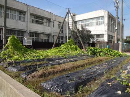 長原ガーデンにあるヘチマやヒョウタンの柵が倒れており、台風の風の激しさを物語っていました。