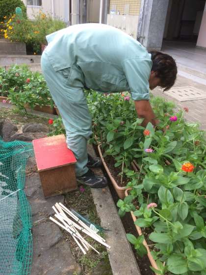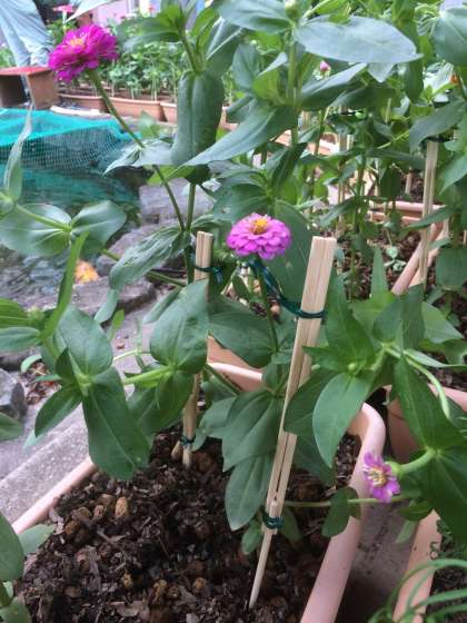 百日草の茎が伸びてきました。管理作業員さんがわりばしで支柱を作り、風が吹いても倒れないようにしています。