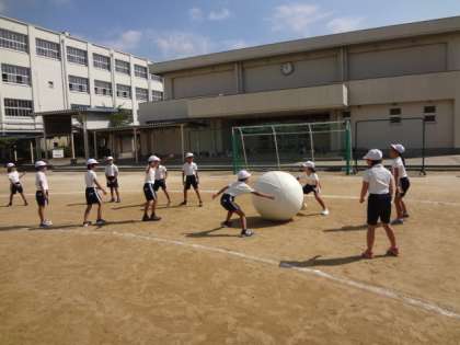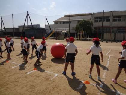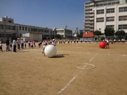 自分の背とそれほど変わらない大きさの大玉に、1年生はとても苦労していました。