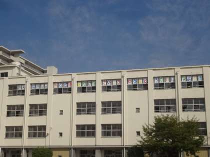 「みんながしゅやくでかがやけるさいこうのうんどうかいにしよう」という紙が、校舎4階の窓に張られています。