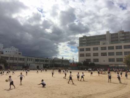 昼前には空が厚い雲に覆われていましたが、お昼休みには雲の間から太陽の光が差し込み、運動場で遊ぶ子どもたちを照らしていました。