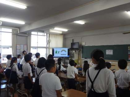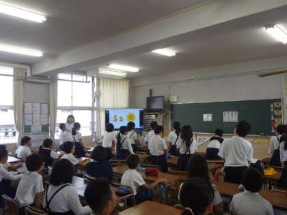 フォニックスの歌は、“前の方の席の子”と“後ろの方の席の子”を交互に立たせて歌うなど、動きを取り入れて活動しています。