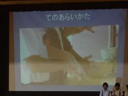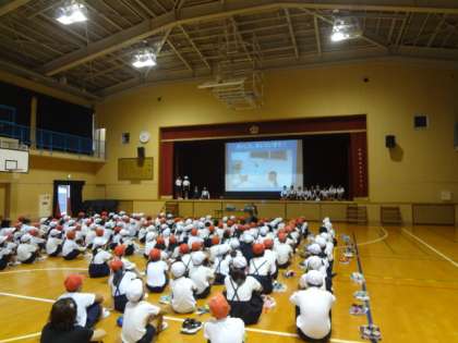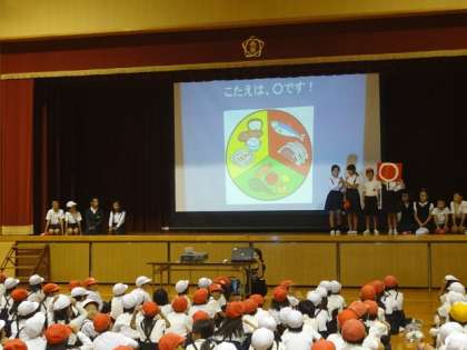 ビデオを上映しながら委員会の仕事を紹介し、給食に関するクイズを使って、栄養や食べ物の働きについてわかりやすく紹介していました。