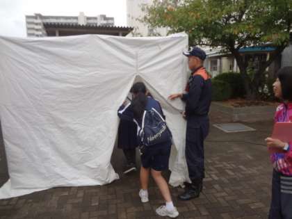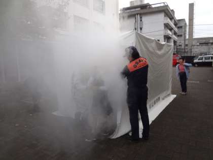 インターロッキングに設置されたテントに充満した煙の中を、出口のスズの音を頼りに壁伝いに移動しました。時間は数秒間でしたが、多くの子どもたちはテントから出てきた瞬間ほっとした表情を見せていました。終了後、消火訓練グループとチェンジしました。