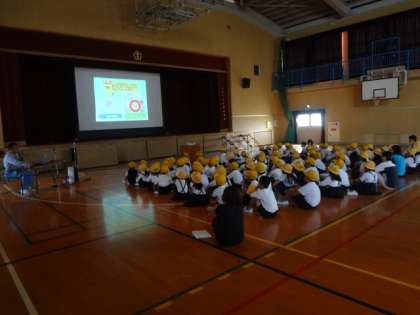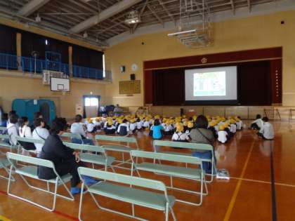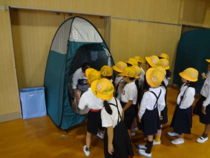 前半の時間、低学年グループは1〜3年生合同で、講堂で平野区役所の方から避難する際の注意点などについてクイズ形式で話を聞きました。その後、避難所の間仕切りや、簡易トイレなどについて見学しました。