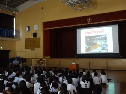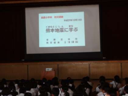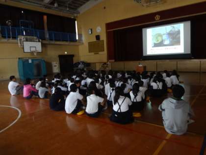 後半の時間、高学年は4〜6年合同で、講堂で平野区役所の方から「熊本地震」や「避難所の様子」についての話を聞きました。実際に訪問された方から、避難所の生活や食べ物など写真を交えて具体的に話を聞くことができました。