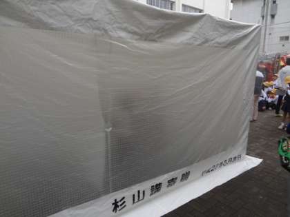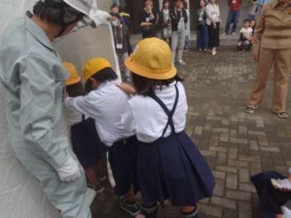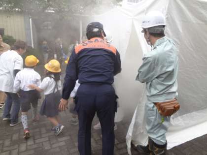 前回経験のある3年生児童が、1年生といっしょにテントに入り、出口まで移動しました。