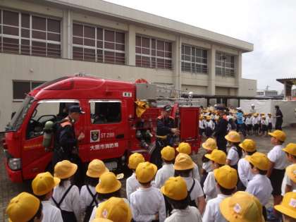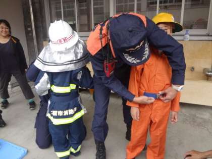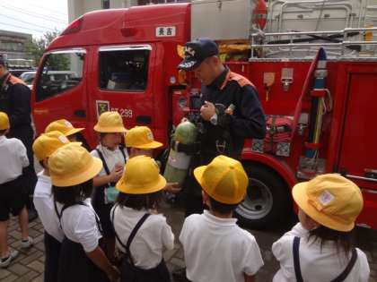 後半の時間、もう1つのグループは消防車をについての説明を聞き、代表の児童が消防服を試着しました。