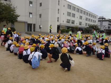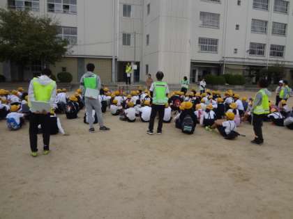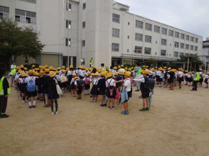 全児童が教室に戻って一日の振り返りをした後、集団下校訓練をしました。