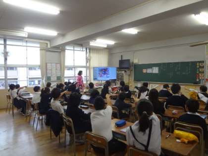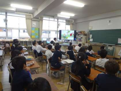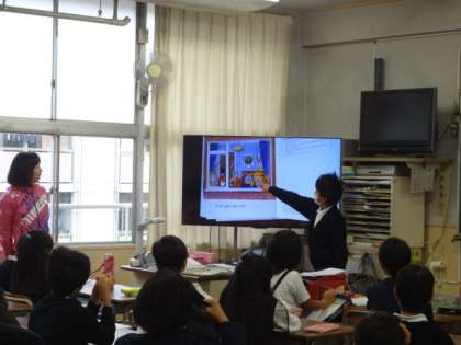 先生が絵本を見せながら英語を読み、子どもたちはいろいろな質問に答えます。