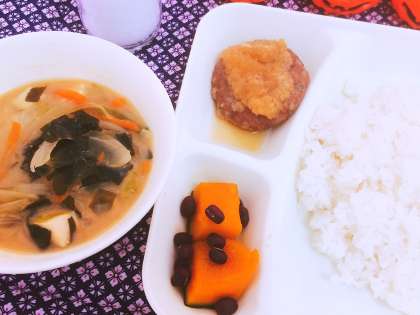 和風おろしハンバーグ……焼いたハンバーグに、だいこんおろし、ゆず果汁などで作ったタレをかけてさっぱりと仕上げています。