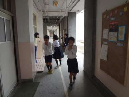 “フッ化物”が歯の表面に定着するのに最低30分間かかるため、子どもたちは口をタオルで押さえながら教室に帰りました。