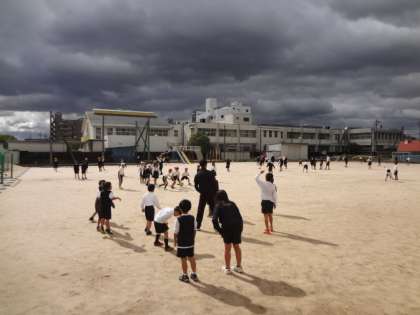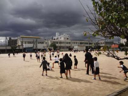 時折厚い雲が空を覆いましたが、風が強いため雲の流れも速く、すぐに校庭に陽が差し込みました。子どもたちは元気に校庭で遊んでいました。