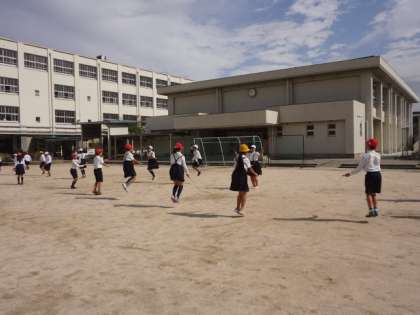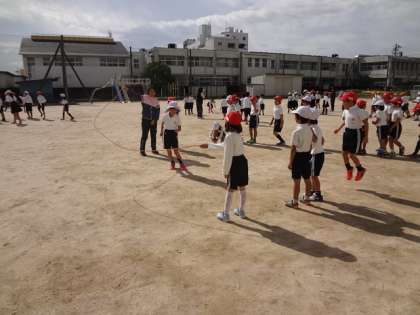 15分休みに「なわとびタイムがはじまるよ〜」という放送が入ると、子どもたちは一斉に運動場に出てきて、放送に合わせていろんな種類でなわとびをしました。