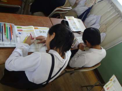 先週に引き続いて、Tシャツについている模様や色などを伝える勉強をしました。まず、各自色鉛筆を使ってオリジナルTシャツをかきました。