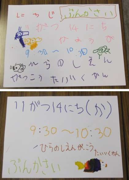 来週11月14日(火)に平野支援学校・文化祭リハーサルが行われますが、その招待状が届きました。毎年招待してくださる2年生と5年生の教室の廊下に掲示しています。