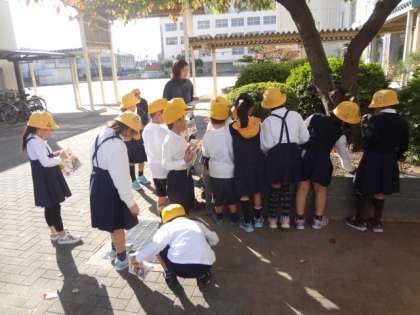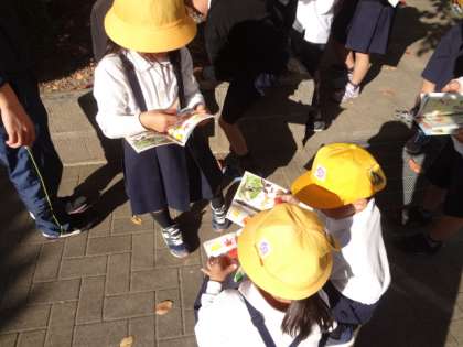 1年生が図鑑(コンパクト版)と落ち葉を比べ、何の木の落ち葉かを調べました。