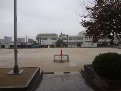 朝礼台の上の“赤コーン”は、運動場使用禁止のしるしです。