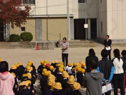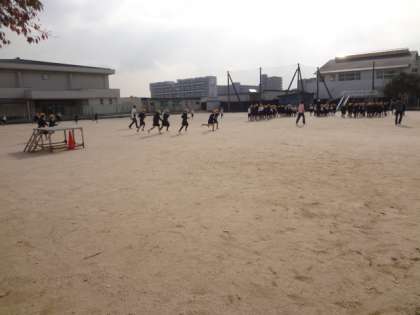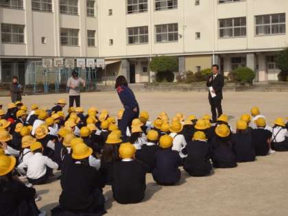警報ベルのあと、「理科室から火災発生。児童のみなさんは、避難の準備をしましょう。……」と放送で子どもたちに伝えられると、みんな速やかに運動場にも避難することができました。新川先生からは“煙の被害にあわないように身を低くして逃げる”という話を聞きました。(校舎の火災を想定しているため、運動場では校舎から離れて避難している様子を見ていただけると思います)