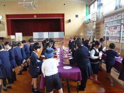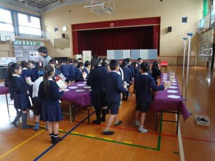 子どもたちは自分が作った立体作品を講堂に持っていき、各学年の展示場所に置いていきました。