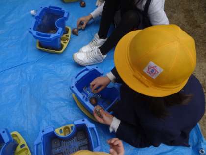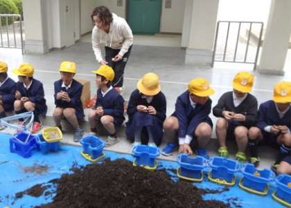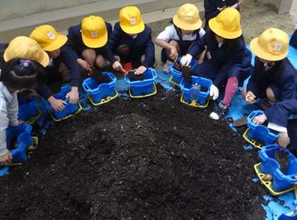 固形肥料や腐葉土を植木鉢に入れ、球根を優しく植えていきました。