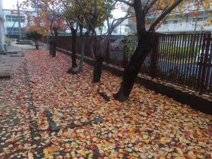 12月1日(金) 校舎の裏側。 知らないうちに、落ち葉のじゅうたんができていました。