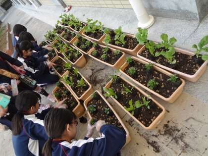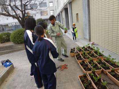 管理作業員さんに苗の植え替え方法を教えていただき、楽しそうに植え替えをしていました。