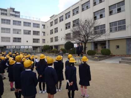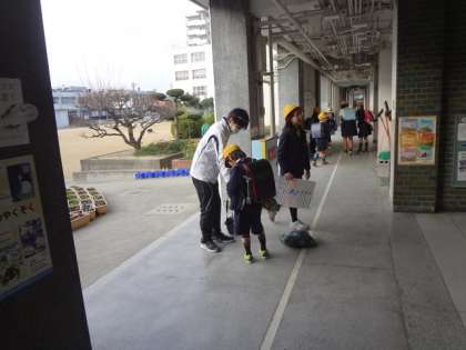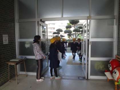 “制服のシャツのボタンを上までとめる”“シャツのすそを入れる”“名札・黄帽をつける”“靴のかかとを踏まない”など服装等を整えてから学校に入るように呼びかけました。