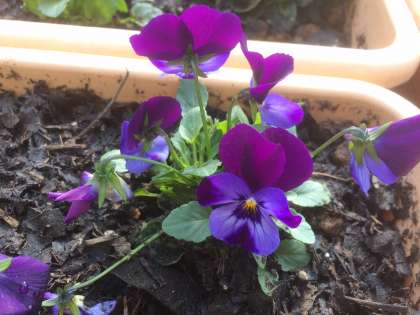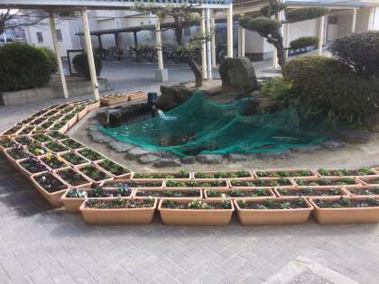 池の周りのパンジーとビオラが少しずつ花を咲かせています。