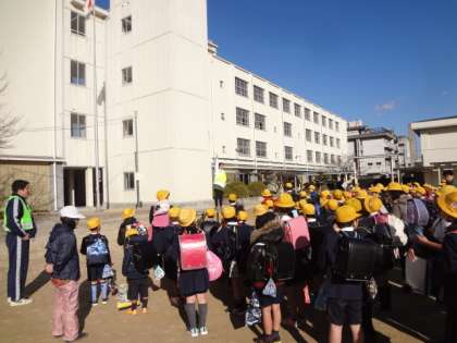 集団下校訓練では、 (1)交通ルールを守る。(2)二列に並ぶ。(3)班長の言ういことを聞く。という三つの約束について、新川先生から再度お話がありました。