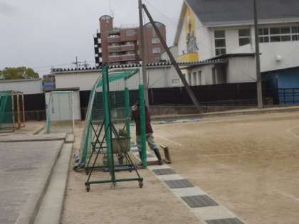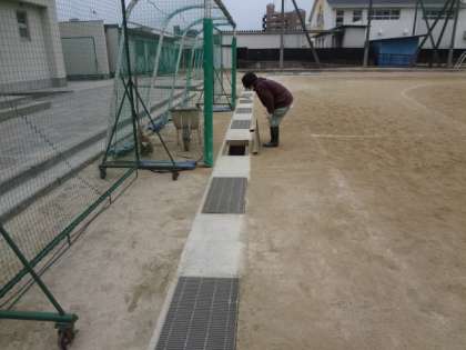 長原小学校は運動場の周りには大きなみぞ(側溝)があり、そこから地下の排水設備につながっているため、とても水はけがよい運動場です。しかし、すぐにそのみぞに泥がたまってしまうため、年に何回か“泥上げ”をしています。水を含んでいるため泥はとても重く、また、みぞがとても長いため、“泥上げ”はたいへんな作業になります。