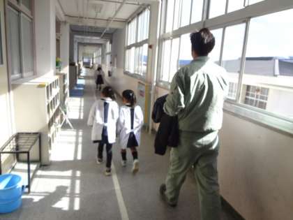 配膳が整うと、子どもたちは1階のお部屋までお迎えに来て、いっしょに教室まで案内しました。
