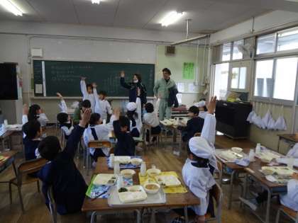 2枚目の写真は「畠山さんといっしょに給食を食べたい!」と子どもたちが手をあげているところです。