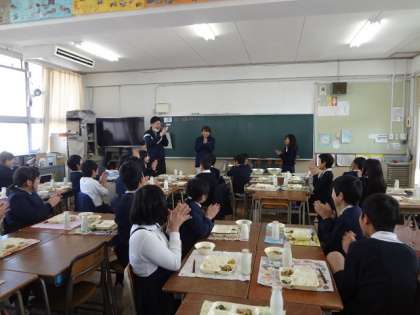 給食週間最終日、6年1組の交流給食は、給食調理員の成尾さんでした。
