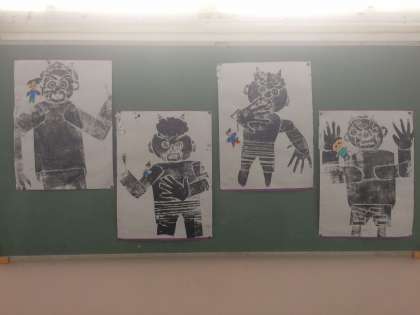 2月2日(金) 2年生が紙版画で“鬼”を作りました。鬼の横にいる小さい人は、“一寸法師”です。