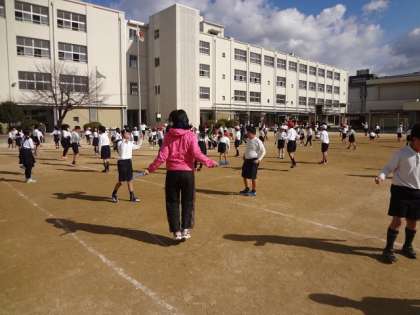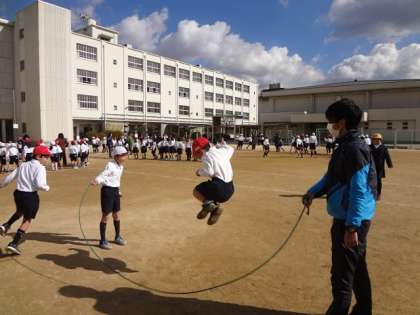 大縄はみんなで数を数え、声をかけあいながらとんでいます。