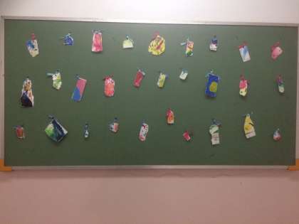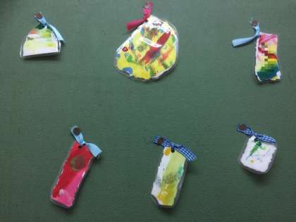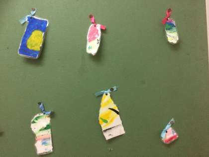 画用紙に絵の具で色を塗り、それを切り貼りしたものを“ラミネート処理”しました。